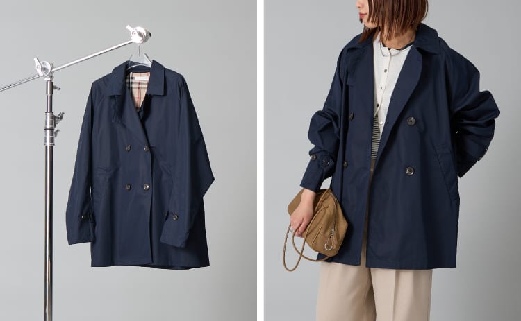 セレモニーシーンなら、ブラウスやハイゲージニットにタックパンツ、足元はローファーやヒールで端正に。ダブルブレストのクラシックさが、式典や会食の場でも浮かず、ほどよい華やかさを添えてくれます。素材は本体コットン100%でハリ感がありつつ、軽やかな着心地に仕上げた設計。