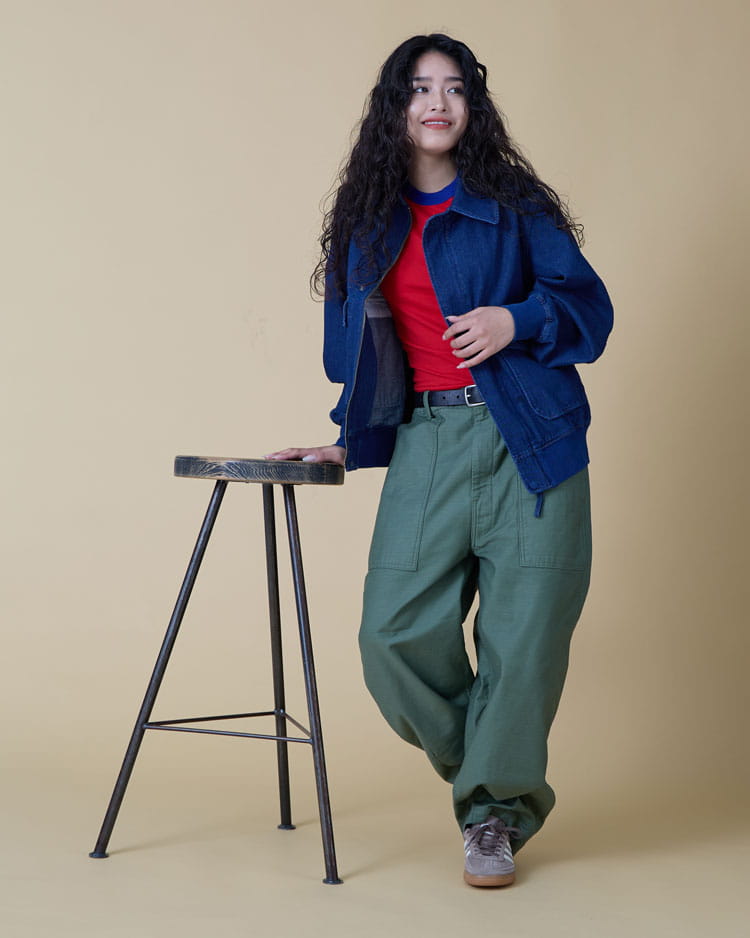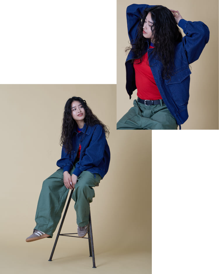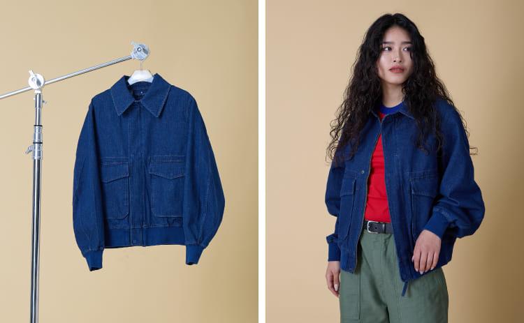 ARMY TWILLの別注A-2デニムブルゾンは、短丈×ゆったりの“いいとこ取り”で、自然にスタイルアップ。加工感の少ないデニムはクリーンな一面もあり、さまざまなスタイリングにマッチするふり幅も魅力です。