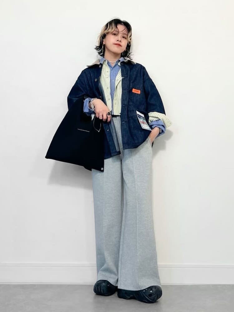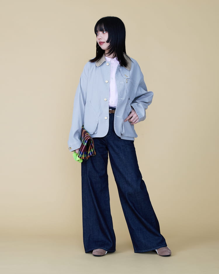 王道ワイドパンツ×ショート丈で“即・今っぽい”バランスになるのはもちろん、シャツ+スラックスで“外し”に使うきれいめミックスにもハマる1枚。デニムは好きだけど、ラフすぎないものがいい方、ワイドパンツが多くて、上半身のバランスに悩みがちな方、軽く羽織れて、長い季節使えるアウターが欲しい方にぜひおススメです。