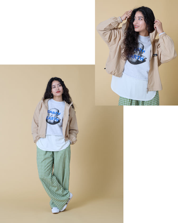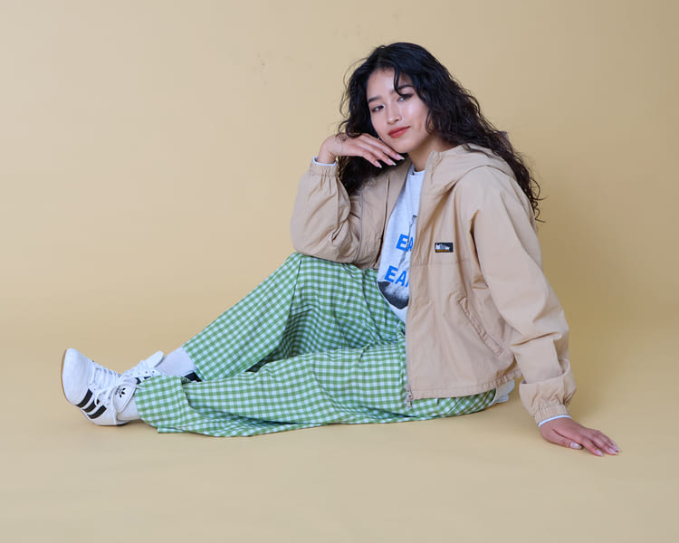 シャツ×デニムの王道カジュアルに合わせればこなれた抜け感が出ますし、写真のようにチェック柄のスカートやギンガムのパンツなど“柄ボトム”と組み合わせても、ナイロンの軽さが全体をすっきりまとめて春っぽさを演出できるのでおススメ。