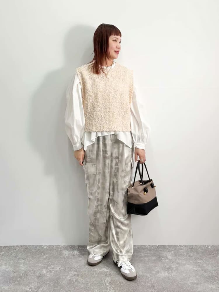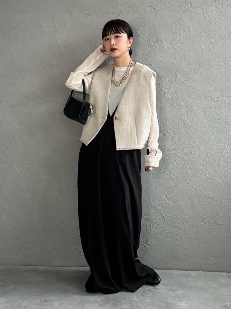 春の「きれいめ」を、かしこまりすぎずに今っぽく楽しみたいなら、“淡いワントーン×異素材レイヤード”が正解。重ねたツイードライクなニットベストが、春らしい軽やかさをキープしながら、きちんと感と奥行きをプラス。インナーでも表情を出せるのでこなれ感を出すのにもおススメ。