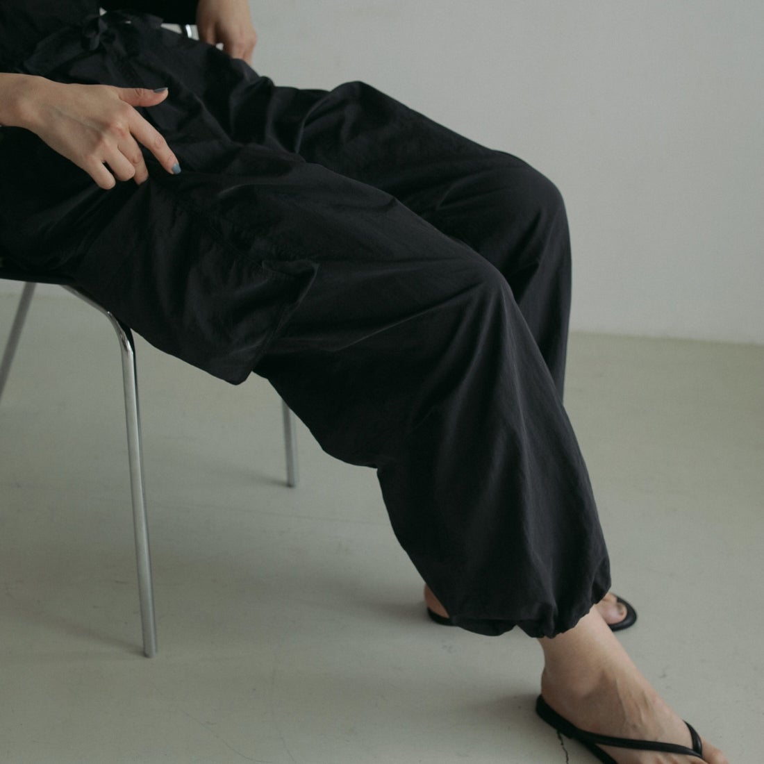 シャリっと薄手で落ち感が綺麗です。ウエストはゴム仕様にはなってますが、それでも大きいので完全に紐で縛って履くタイプになります!